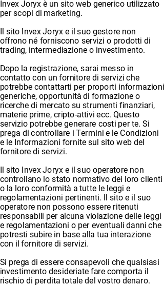 Invex Joryx mira a garantire che tutti i membri abbiano una piena comprensione dei rischi connessi al trading. Ogni investimento potrebbe portare a un guadagno o a una perdita. La volatilità di mercato gioca un ruolo chiave nelle fluttuazioni dei prezzi di azioni, asset e altri investimenti.